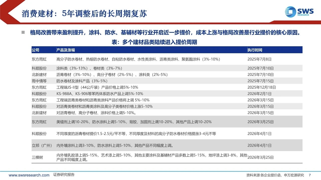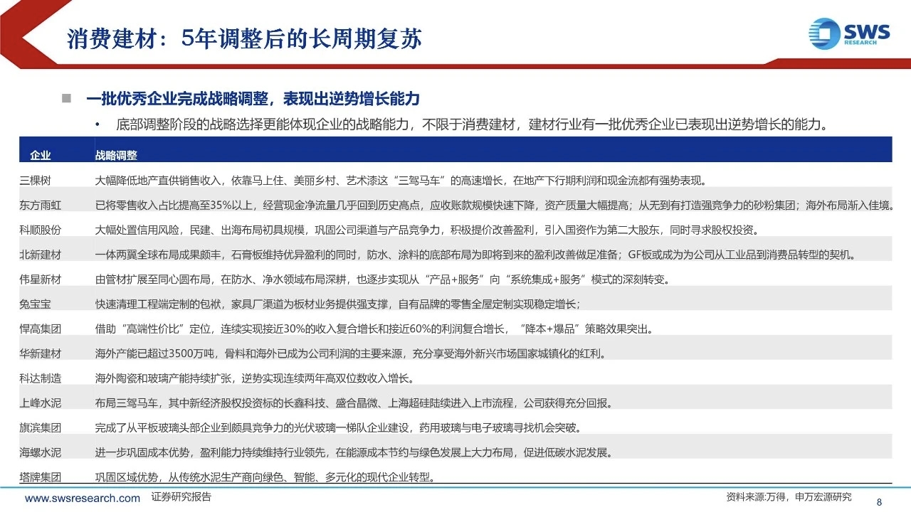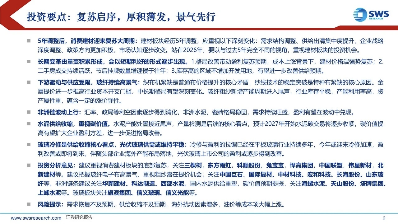 5年调整后,消费建材迎来复苏大周期:建材板块经历5年调整,应重视以下深刻变化:需求结构调整、供给出清集中度提升、企业战略深度调整、政策方向更加积极、市场认知逐步改变。站在2026年,要以与过去5年完全不同的视角,重视建材板块的投资机会。