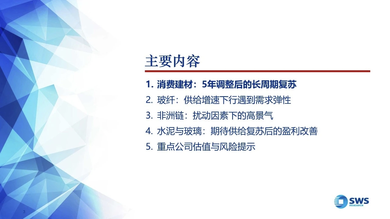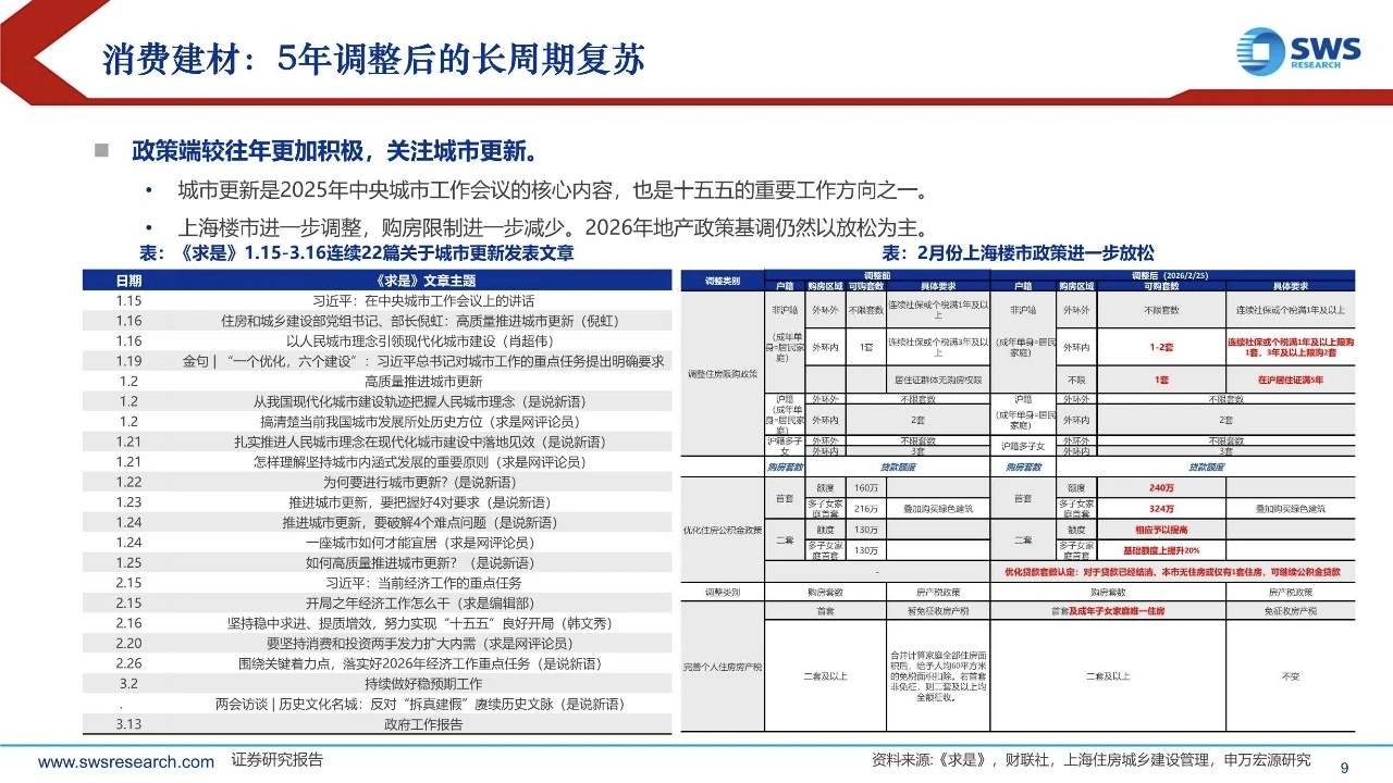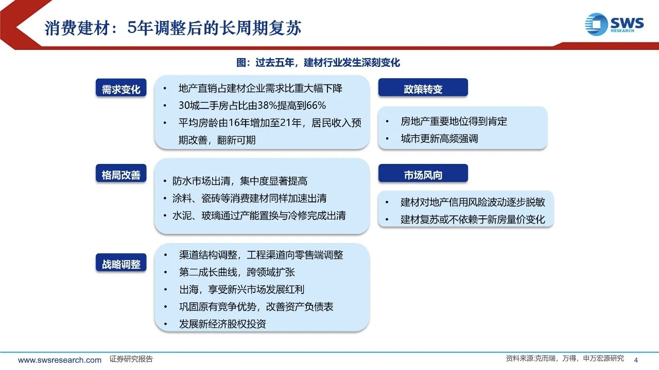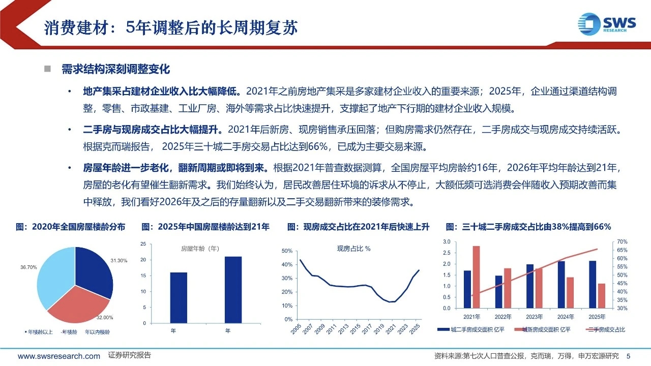 5年调整后,消费建材迎来复苏大周期:建材板块经历5年调整,应重视以下深刻变化:需求结构调整、供给出清集中度提升、企业战略深度调整、政策方向更加积极、市场认知逐步改变。站在2026年,要以与过去5年完全不同的视角,重视建材板块的投资机会。